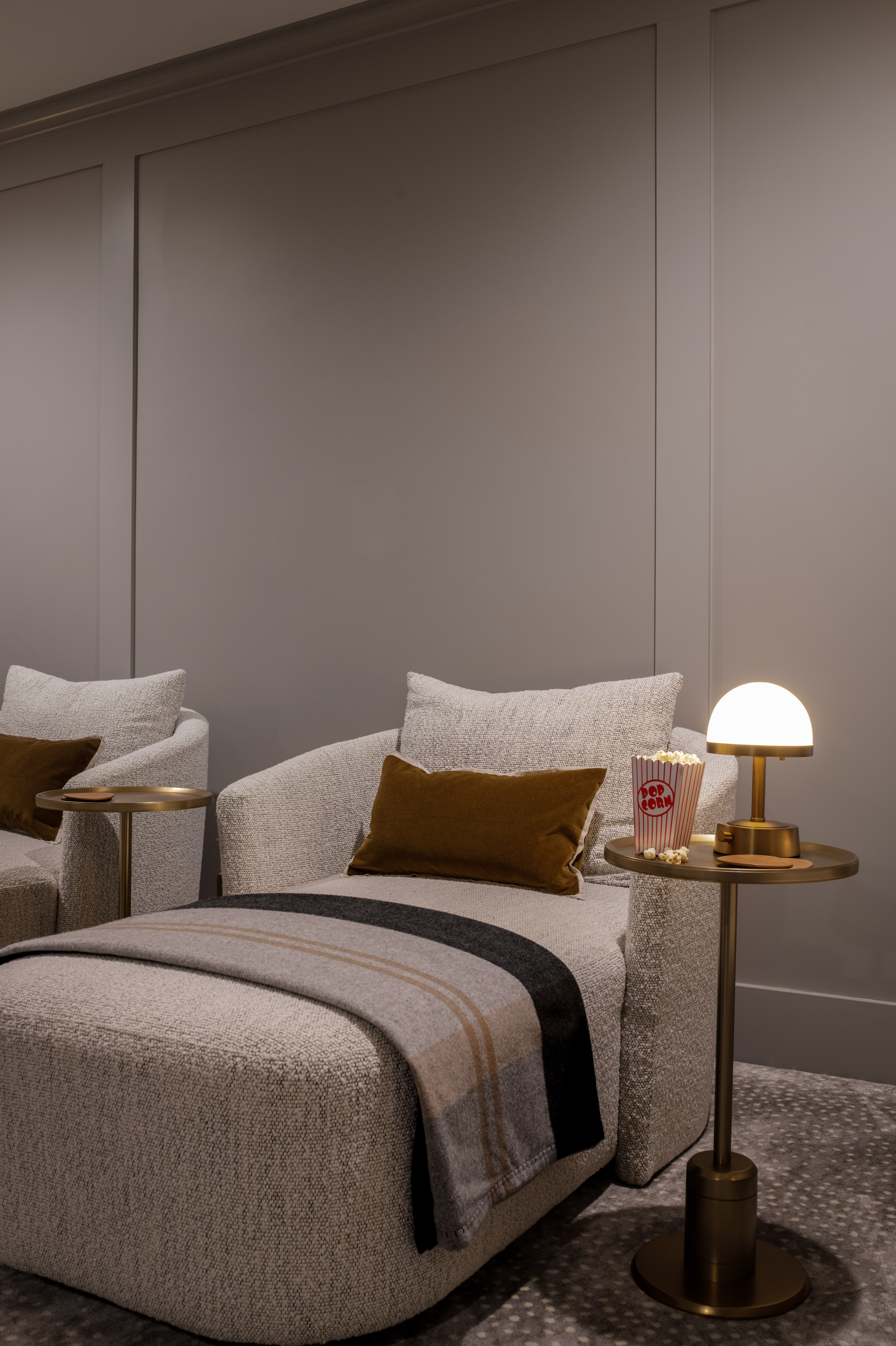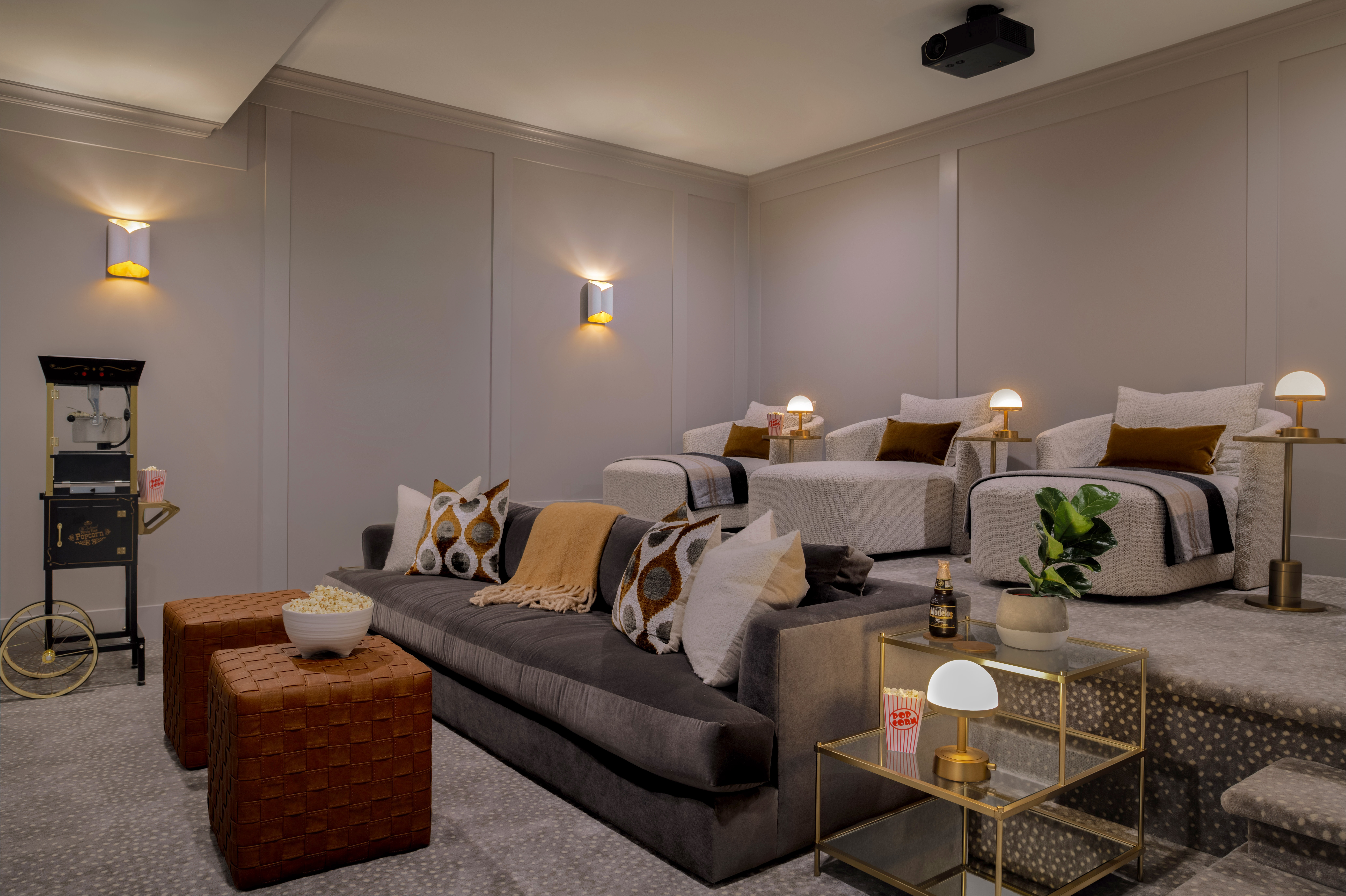 In the basement is where the fun is – the movie theater! We did not get our framed vintage movie posters in time for the shoot, but try to visualize them on the empty walls :) I love a row of chaises in a movie theater- it is the MOST comfy way to watch a film or big game. An indoor outdoor animal print carpet is super plush and great for sound.
