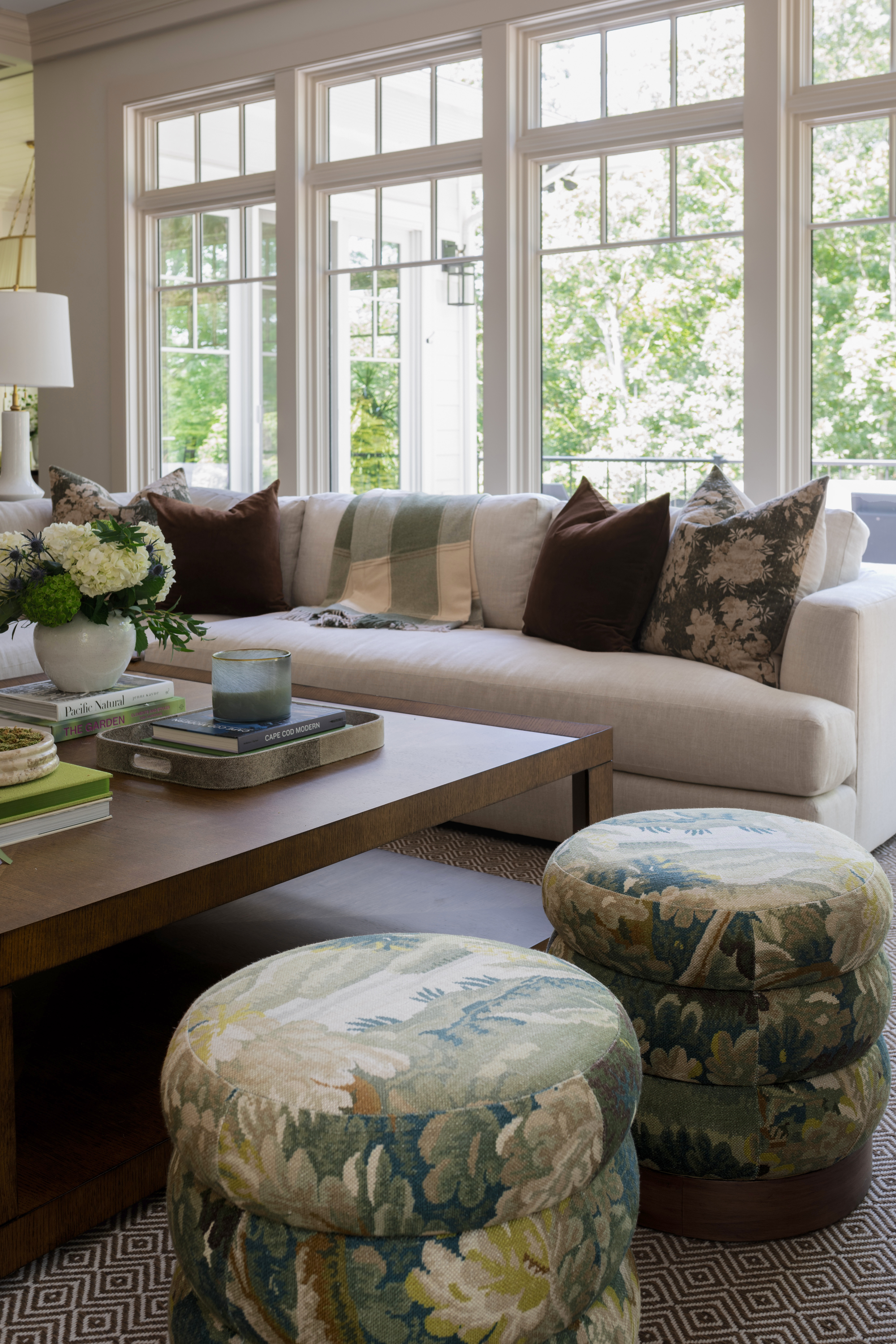 These chairs are Maiden Home in a mohair and I love them… those ottomans are mine from my house that we brought over for the photoshoot, and they do look SO good here. We eventually want to add simple drapes and woven woods in this space to soften the high ceilings and large windows.