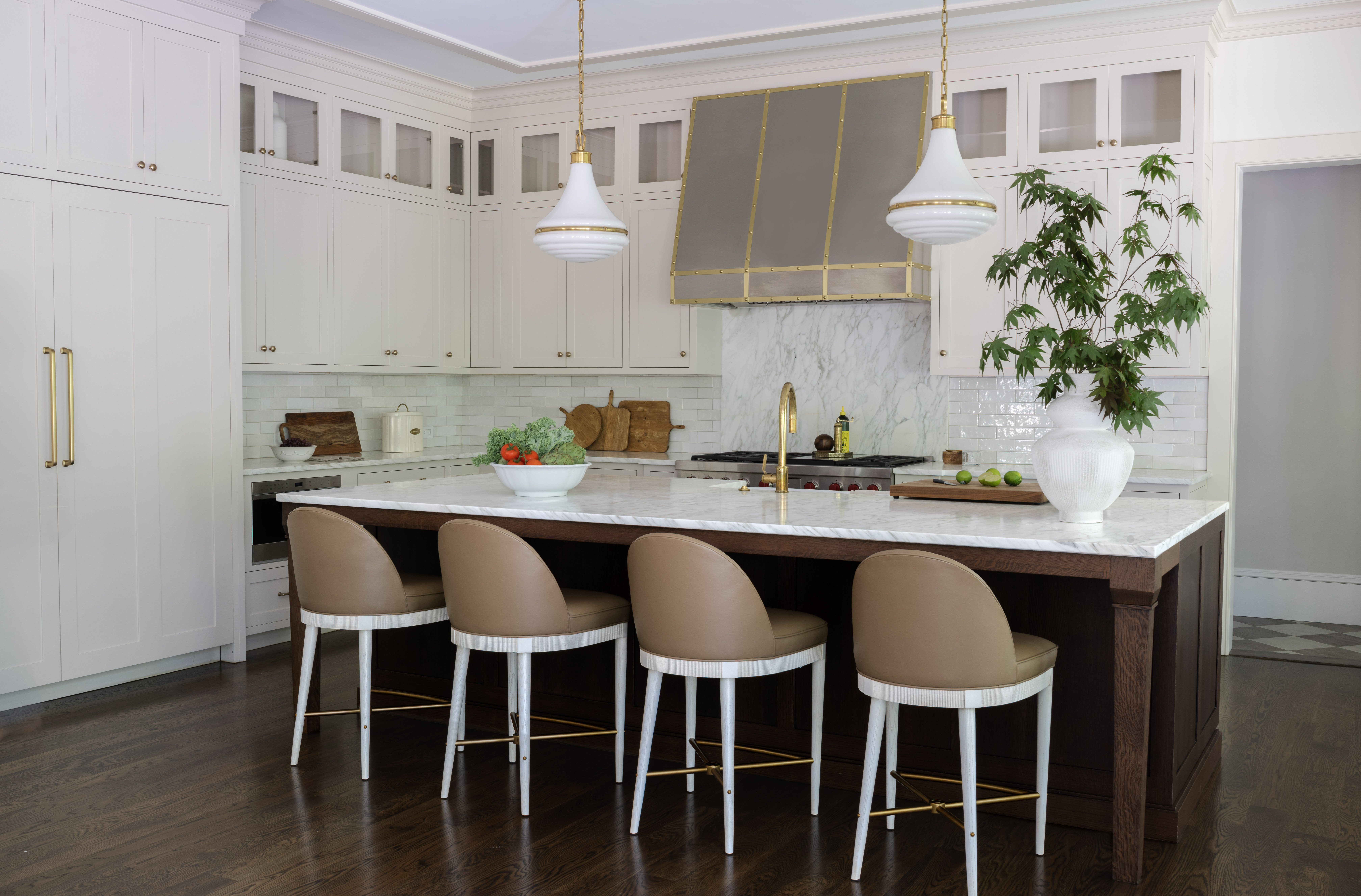 The kitchen – we did tweak the millwork here quite a bit, but stuck to the layout pretty closely. We did a pale neutral cabinet with a walnut island featuring a simple tapered leg, a custom hood, marble counter and splash behind the range, and then an affordable subway all over.