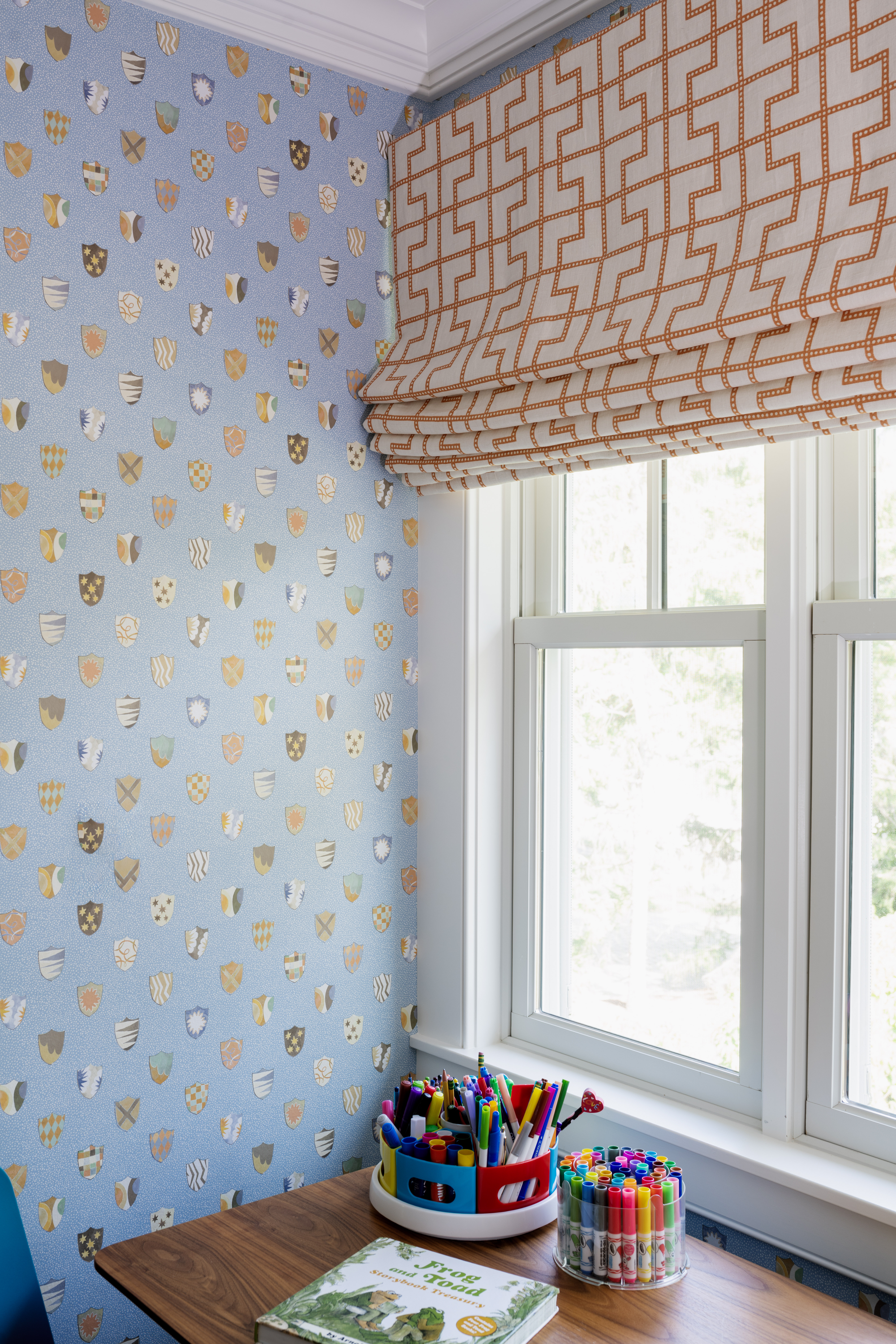 The younger sons bedroom with one of our favorite wallpapers and a piece from Libby Silvia Artstyle. And my cute Kassatex bedding, of course.