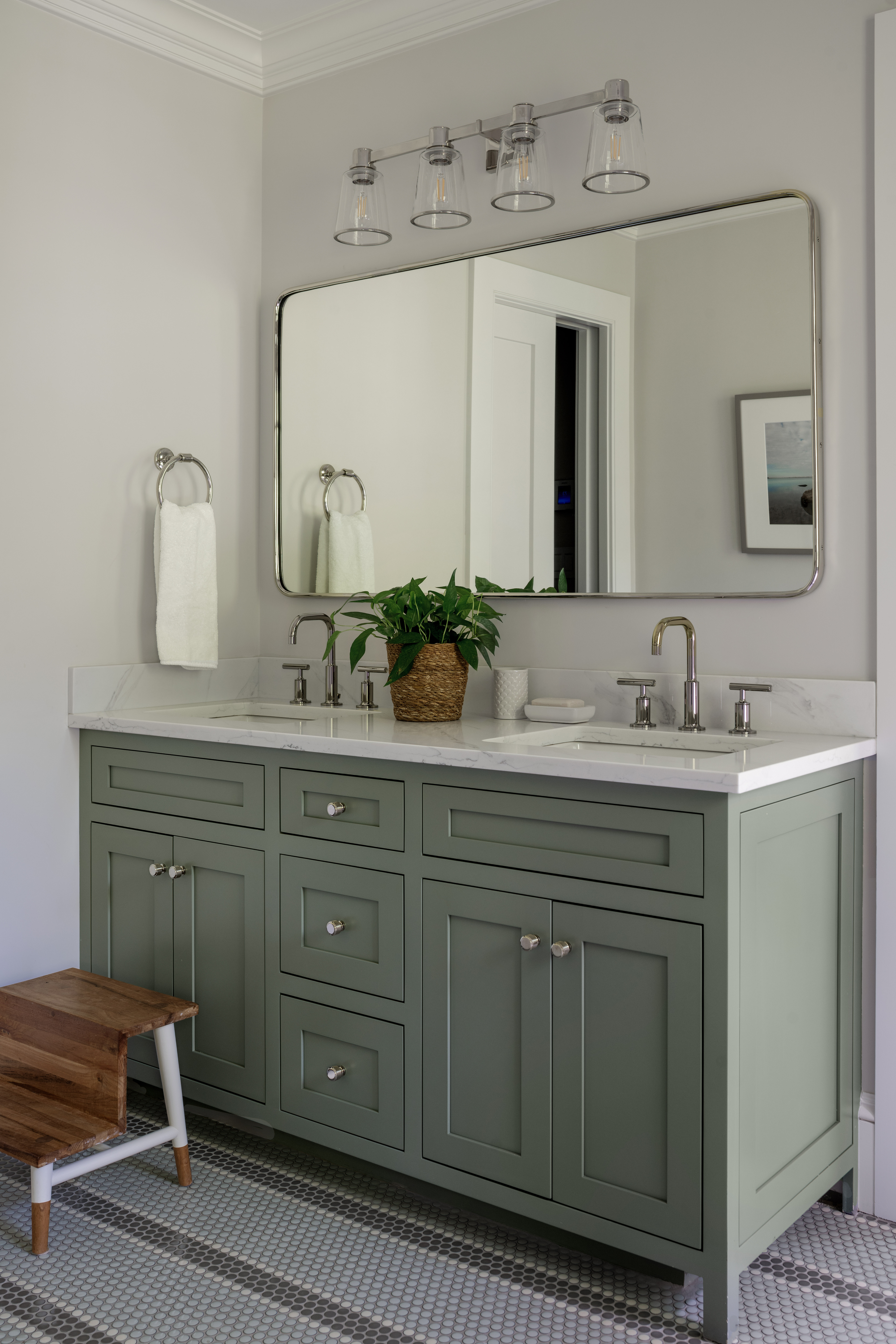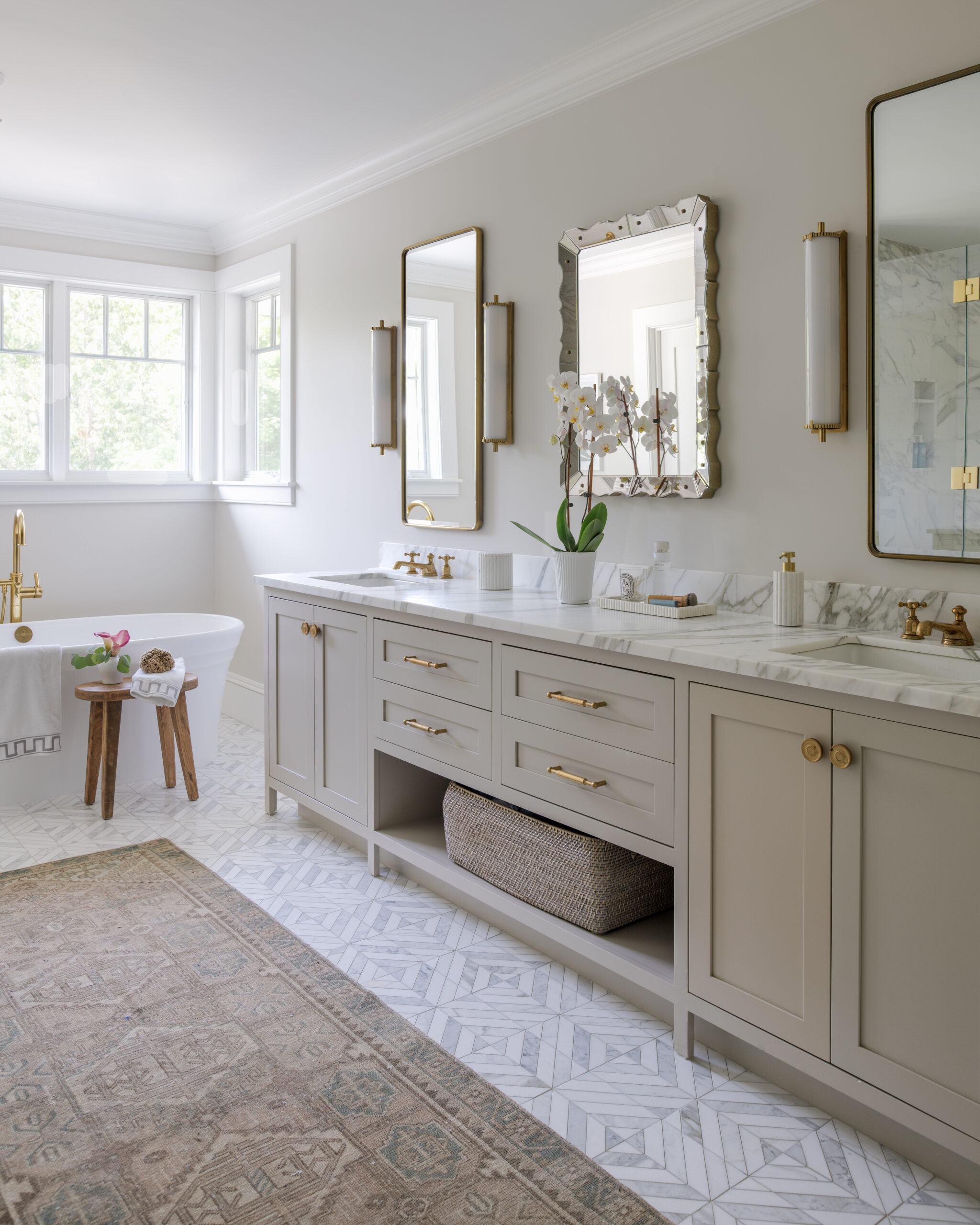 A MASSIVE primary bathroom where we elected to do an expansive greige vanity that needed a third mirror, but we wanted it to look more unique rather than three of the same in a row, so we added in a more decorative one and I love how it came out.