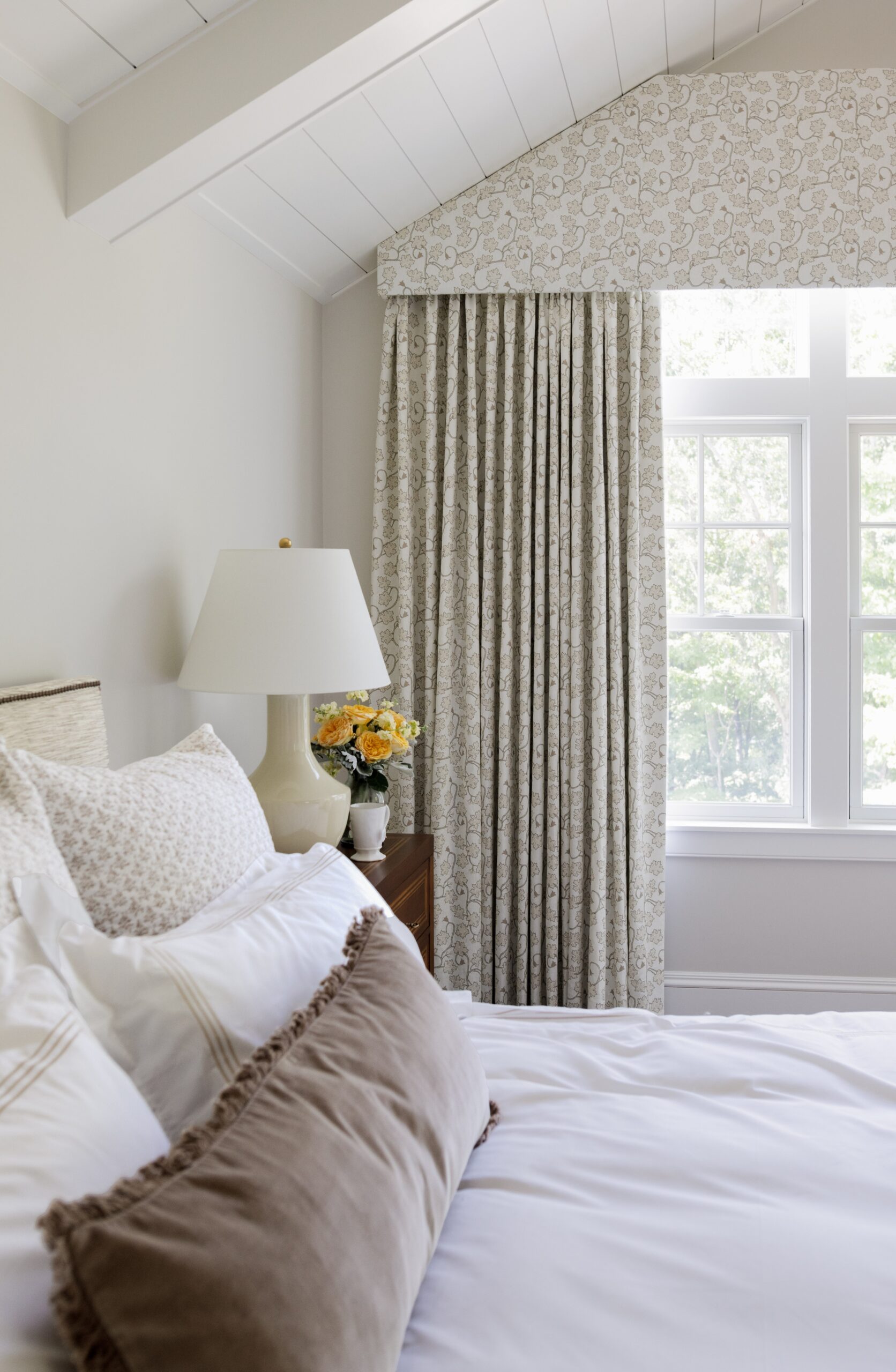 The primary bedroom is 90% there- we have a few more pieces we are swapping/adding but the stars here are the ceilings and the window treatments!